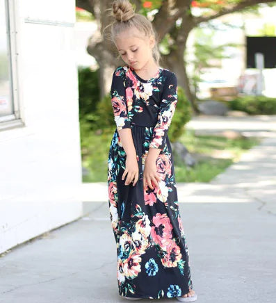Girls' Long Dress with Floral Print and Round Neck